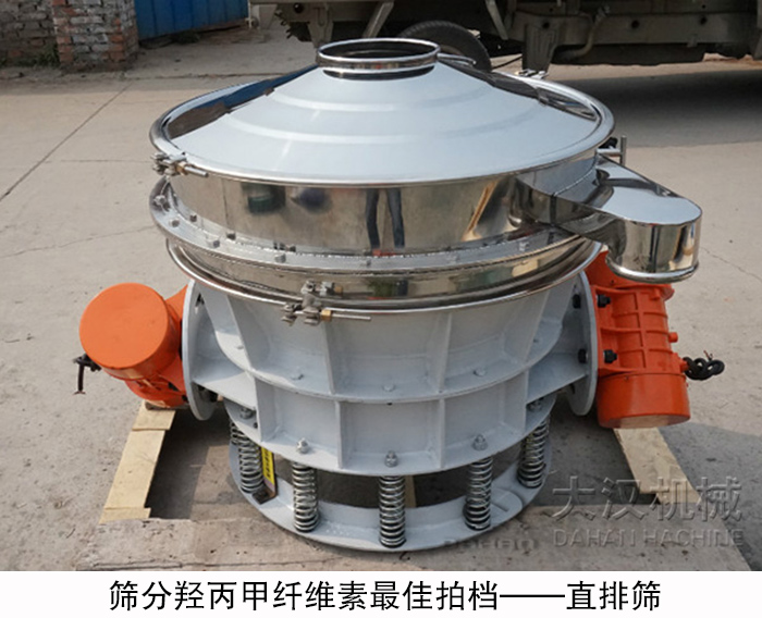 直排篩也稱作直泄式振動篩,它通過安裝在篩機兩側的振動電機產生的振篩機驅動物料在篩面上做上下運動并直接從篩面下方的排料口直接排料,大大減少了物料在篩面上的停留時間,效率非常高,產量是普通振動篩的2-5倍。其大產量的,以及并不是以精度見長的特點讓它非常適合于羥丙甲纖維素的篩分工作。