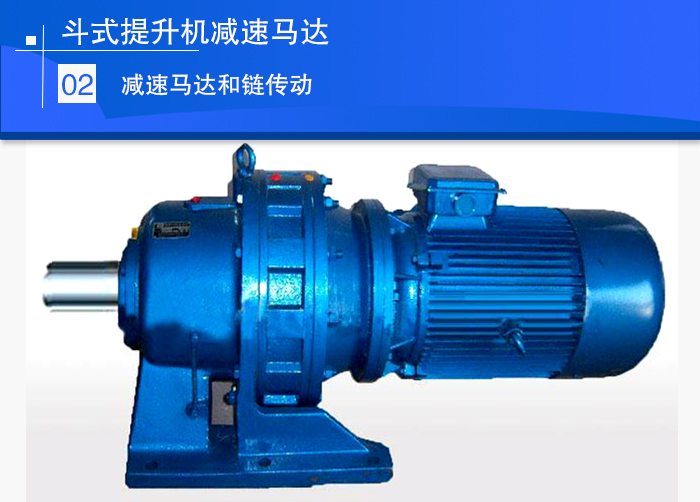 減速馬達和鏈傳動的傳動方式,一般用于提升能力和提升高度較小的低速提升機,由于驅動功率較小,采用減速齒輪馬達和一級鏈傳動,也有不加鏈傳動的直聯方式,結構緊湊,成本較低,但無法加慢速驅動裝置,逆止器也只能加在頭部驅動軸上。